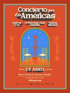 El Museo de Las Américas presenta Concierto por Las Américas un encuentro musical con la participación de la cantautora Andrea Cruz, la cuatrista Fabiola Méndez y el Orfeón San Juan Bautista dirigido por Guarionex Morales Matos. El imponente teatro de la Escuela Libre de Música de San Juan será la sede de este magno evento que contará a su vez con el acompañamiento de los reconocidos músicos: Wilfrido Vargas Marte, Josiane Feliciano Román, Francisco C. Marrero Pérez, Carlos Camilo Pentzke y William H. García Rodríguez. El repertorio de canciones incluirá temas originales de los compositores con piezas que conmueven y atraviesan nuestra memoria colectiva. Una oda a cantantes como: Susana Baca, Mercedes Sosa y otros, promete un emotivo recorrido por las voces que han tejido e inspirado nuestro canto caribeño.