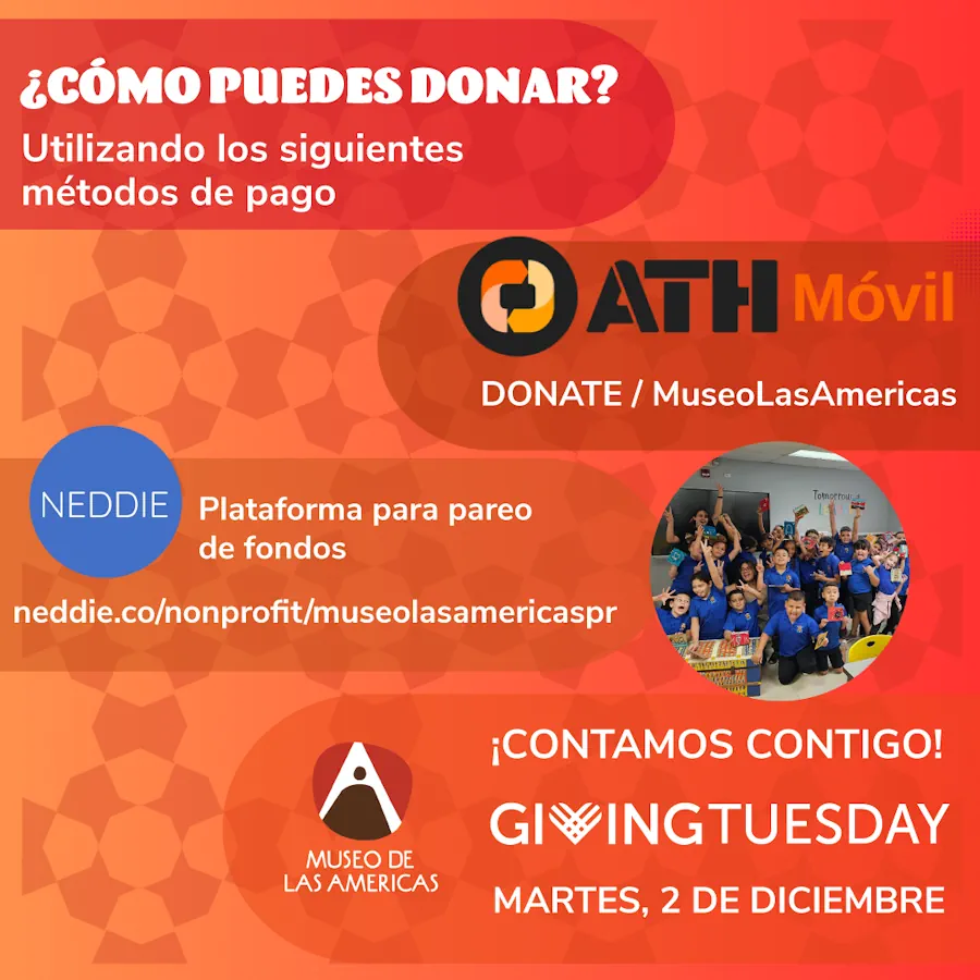 Puedes hacer tu aportación a través de ATH Móvil, sección Donar/MuseoLasAmericas, o utilizando tu tarjeta de crédito,